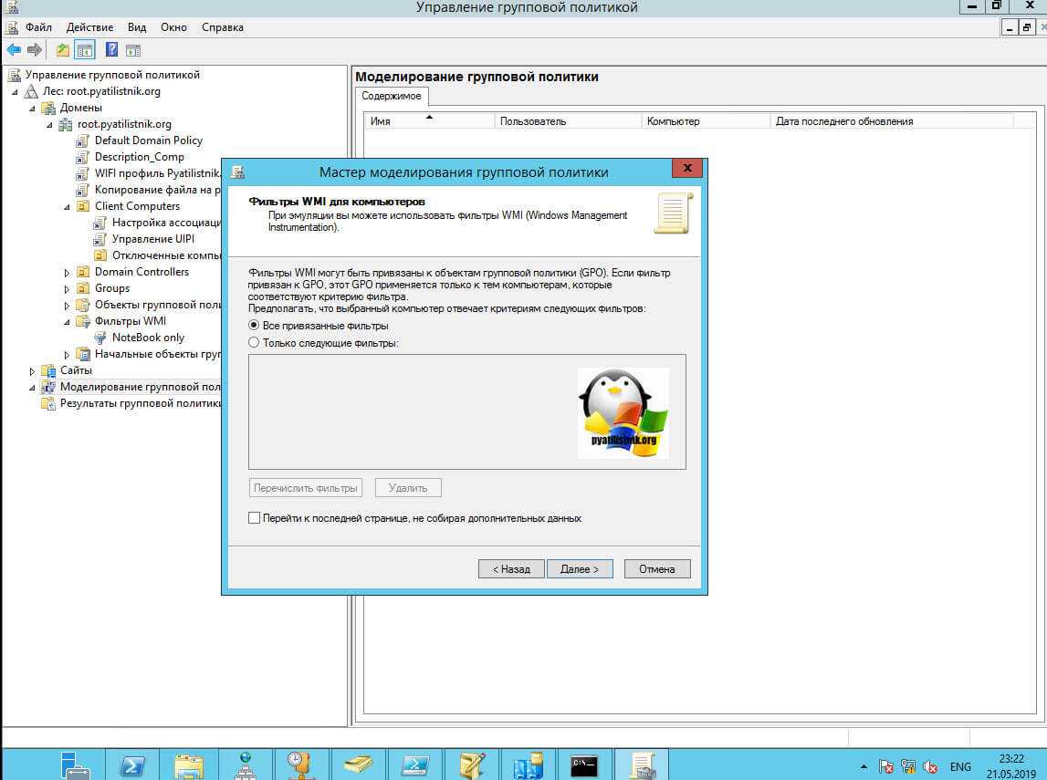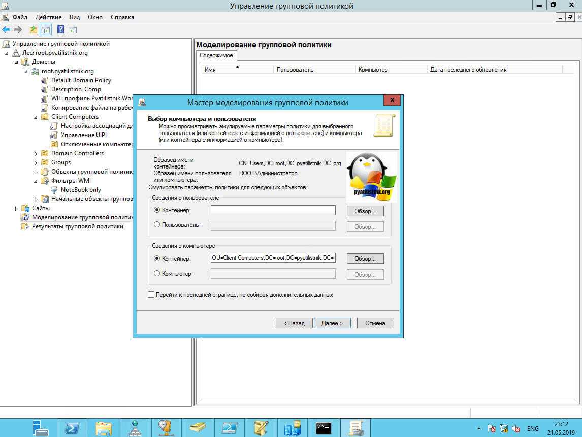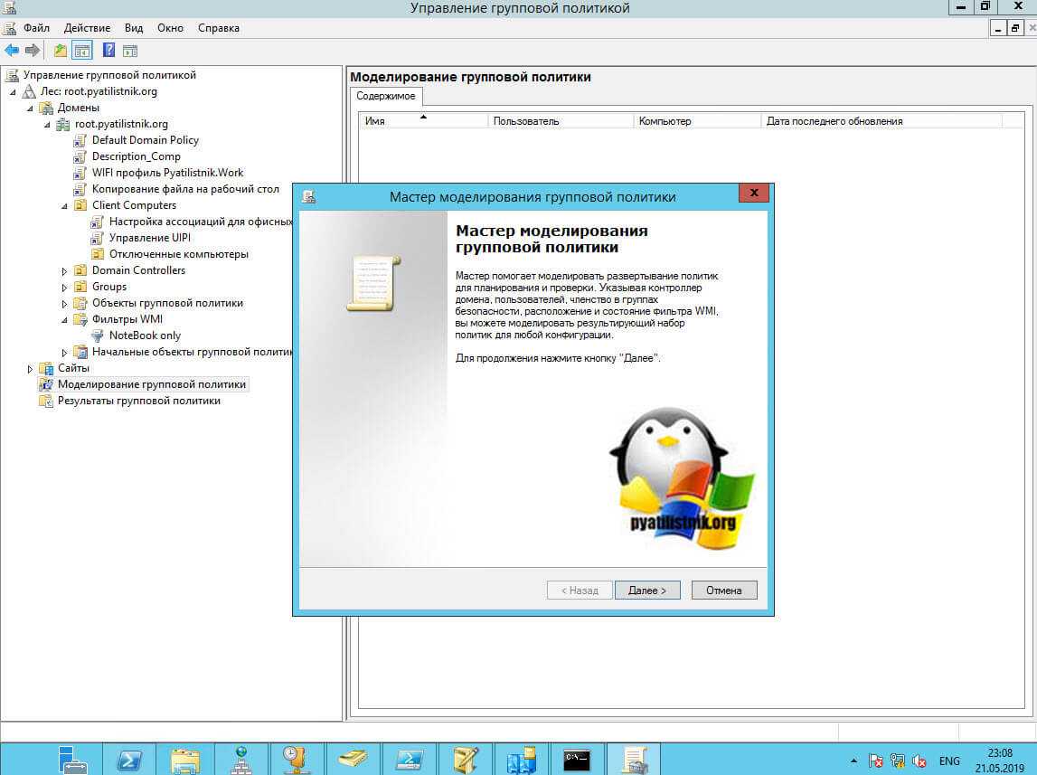 На первом шаге мастера моделирования групповой политики, будет простое уведомление, что к чему, нажимаем далее.
