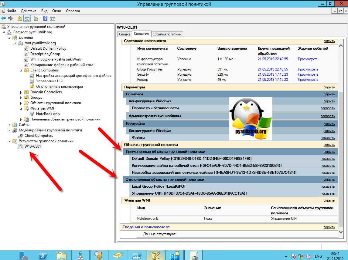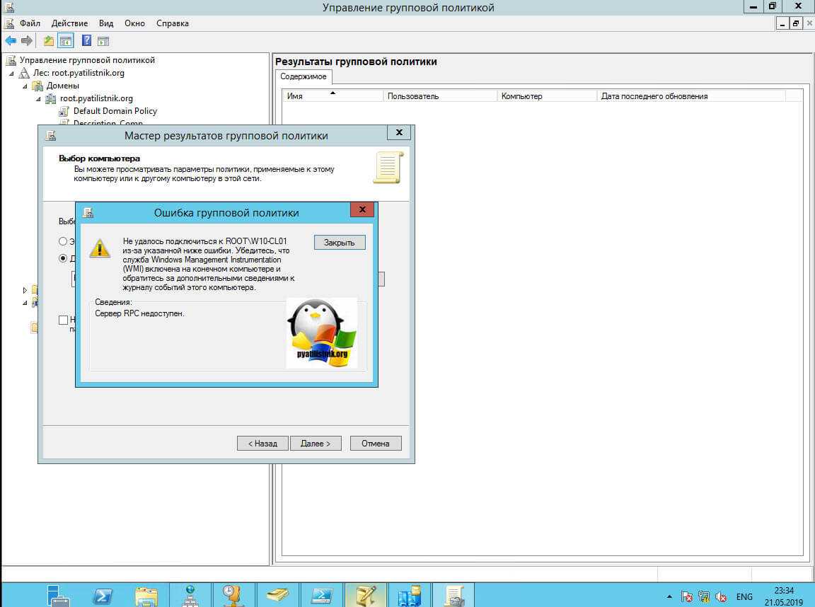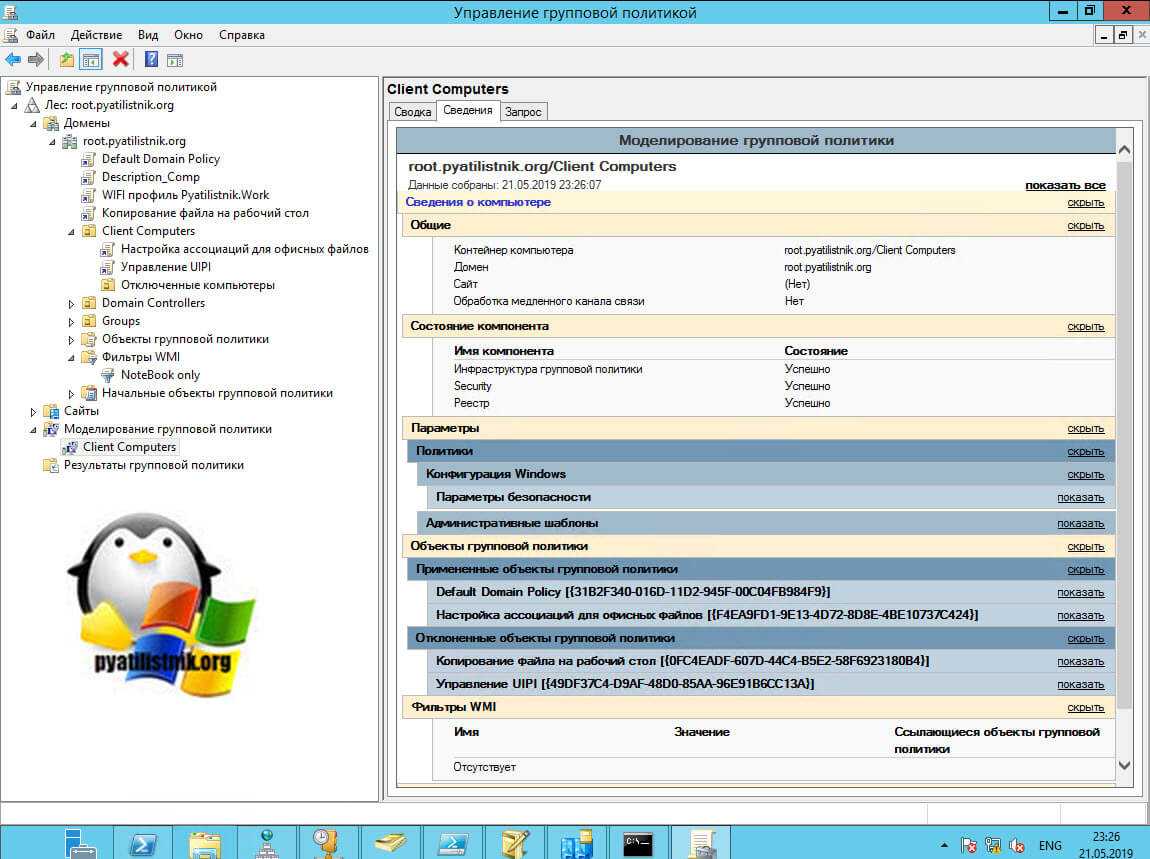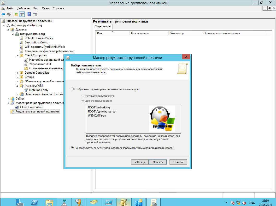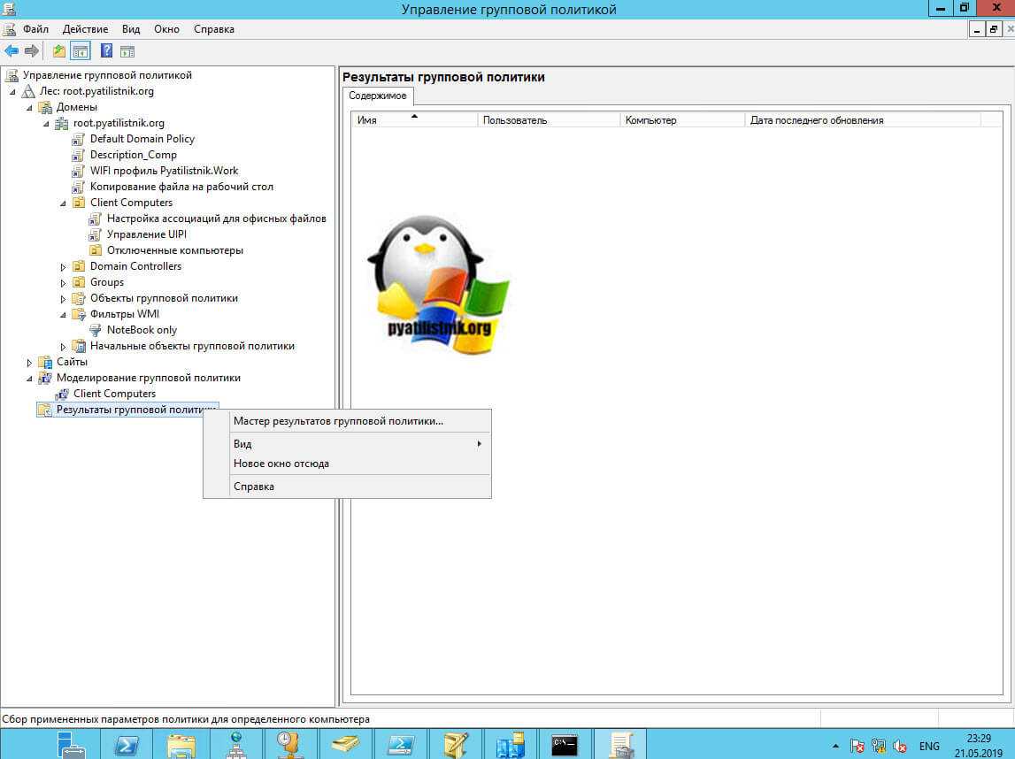 В оснастке GPMC есть возможность посмотреть какие политики применяются к нужному объекту групповой политики. Данный мастер называется «Результат моделирования групповой политики». Щелкаем по нему правым кликом и открываем мастер.