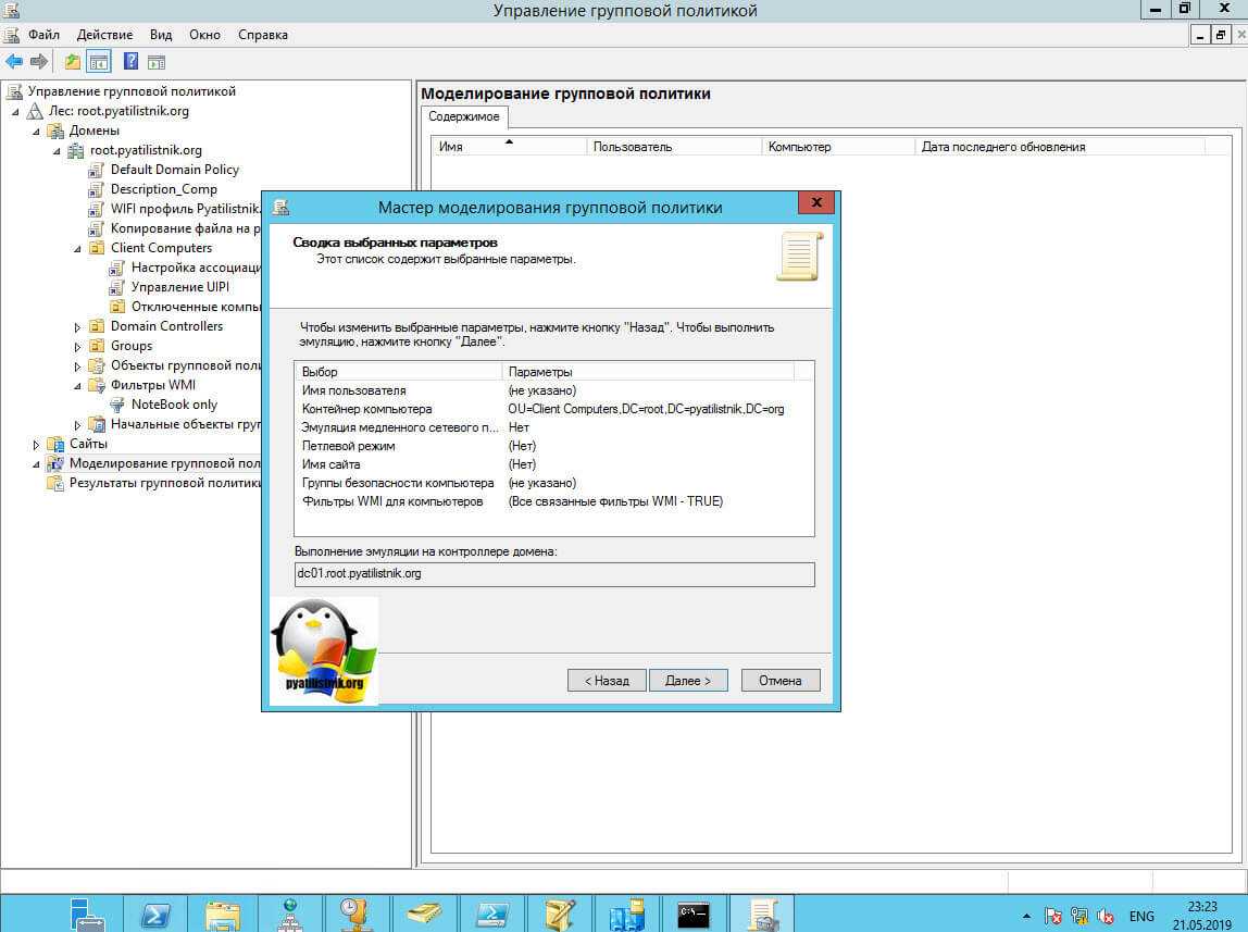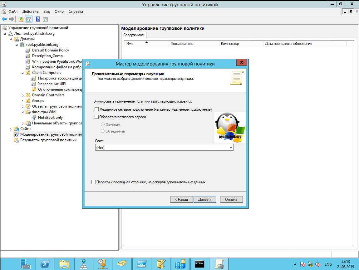 На следующем шаге мастера моделирования групповой политики, вам предоставят сэмулировать таки параметры: