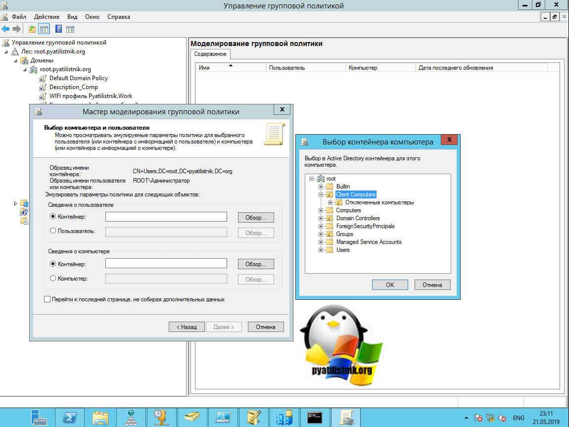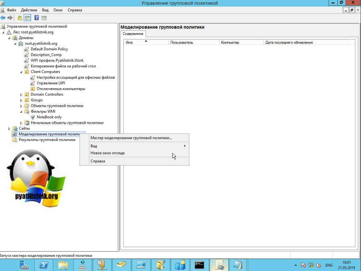 Последним удобным инструментом диагностики и моделирования групповой политики, выступает функционал GPMC, под названием «Моделирование групповой политики». В задачи которого входит проверка применения политики в существующей ситуации, так и просто тест без реальной прилинковки к OU, указав нужный объект. В оснастке GPMC выберите пункт «Моделирование групповой политикой» и щелкните по нему правым кликом, выбрав «Мастер моделирования групповой политики».
