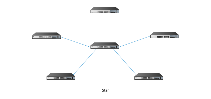 В звездной топологии все коммутаторы в сети соединены с коммутатором ядра через соединение точка-точка. Таким образом, информация передается от центрального коммутатора к узлу назначения, причем любая связь между двумя коммутаторами в звездной сети контролируется центральным коммутатором. Звездная топология широко используется для соединения нескольких гигабитных коммутаторов вместе.