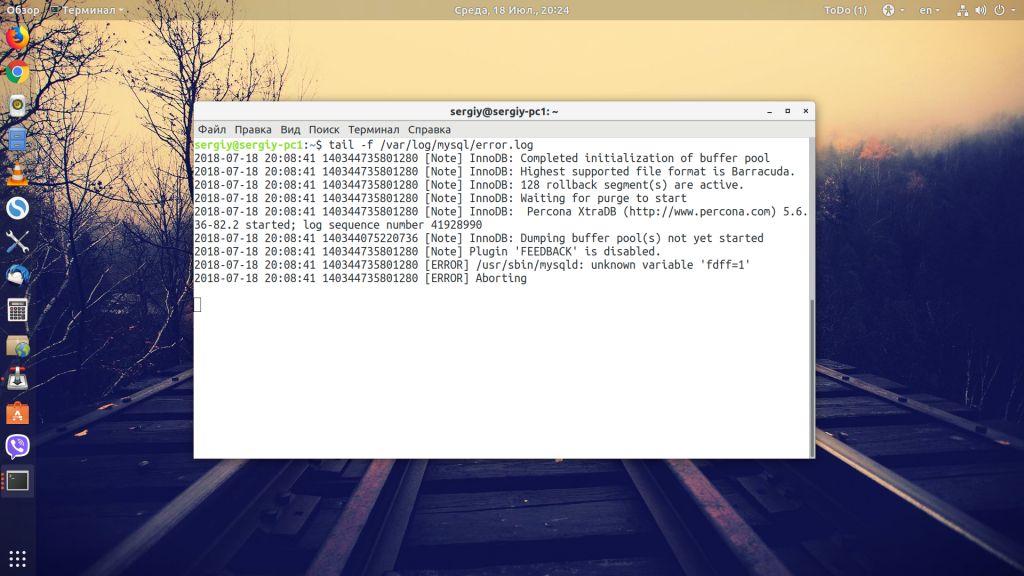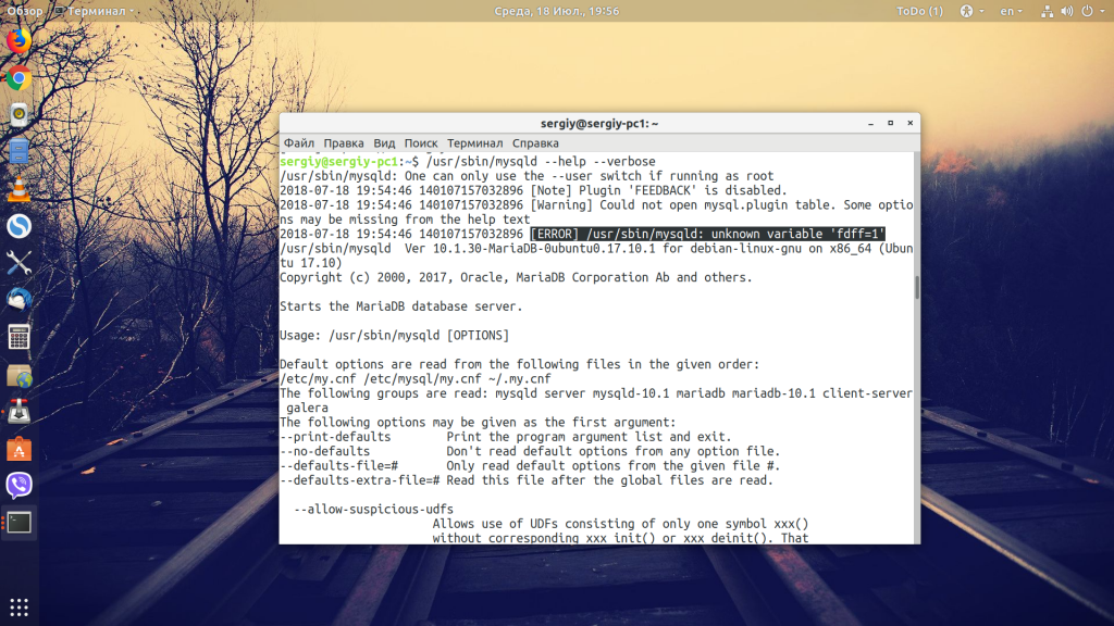 В начале вывода будут представлены обнаруженные в основном конфигурационном файле ошибки. Например, здесь я специально добавил несуществующую переменную. Вам остается только исправить ошибки и перезапустить mysql: