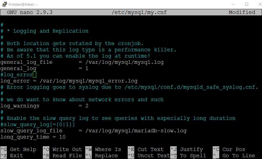 Как видим, по умолчанию, включены только бинарные логи, но для контроля работоспособности и быстрого выявления ошибок сервера MariaDB, необходимо включить главный лог — general_log и лог ошибок — log_error.