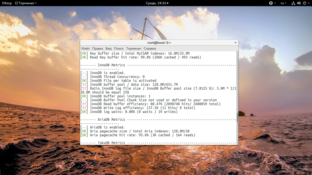 Буквально за несколько минут скрипт выдаст полную статистику по работе MySQL. Количеству запросов, занимаемому объему памяти и эффективности работы буферов. Вы можете ознакомиться со всем этим, чтобы лучше понять в чем причина проблем. Проблемные места обозначены красными восклицательными знаками. Например, здесь мы видим, что размер буфера движка таблиц InnoDB (InnoDB buffer pool) намного меньше, чем должен быть для оптимальной работы: