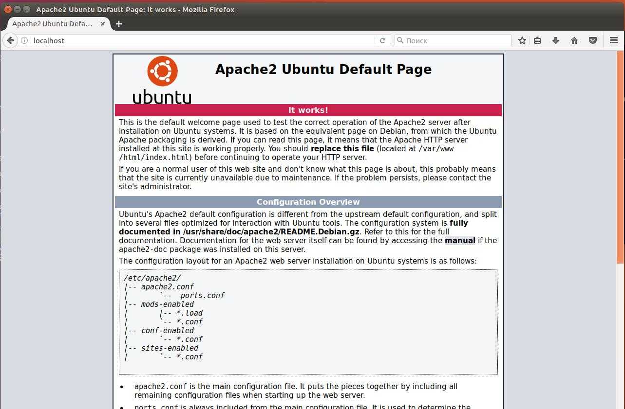 4. Для проверки работы веб-сервера apache, откройте в браузере IP адрес сервера. Если вы устанавливаете на локальном компьютере, но наберите localhost. Должна появиться страница по умолчанию для веб-сервера, примерно как на скриншоте: