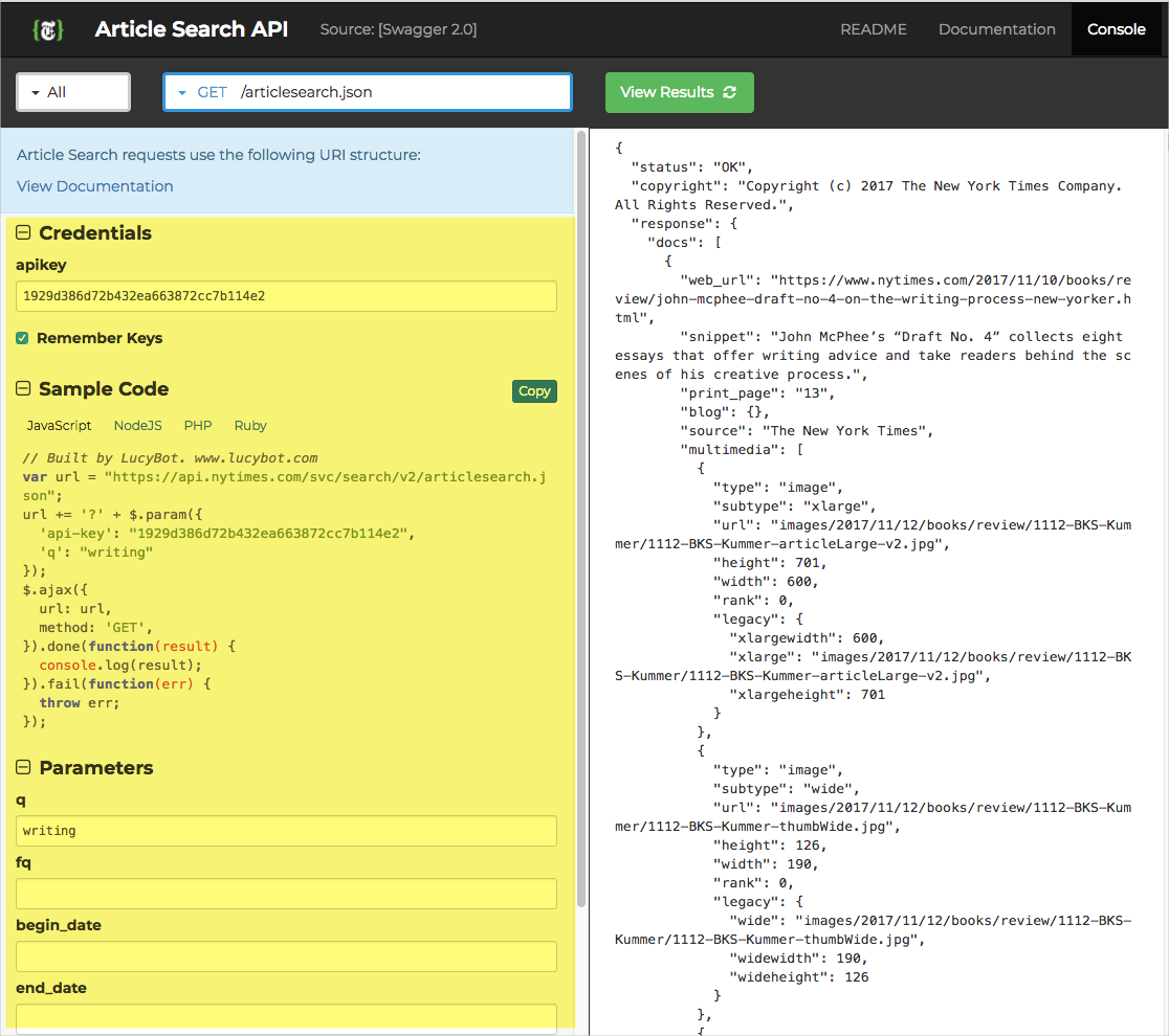 API Explorer позволяет вставлять свои собственные значения, свой собственный ключ API и другие параметры в запрос, чтобы увидеть ответы непосредственно в API Explorer. Возможность видеть свои собственные данные делает ответ более реальным.