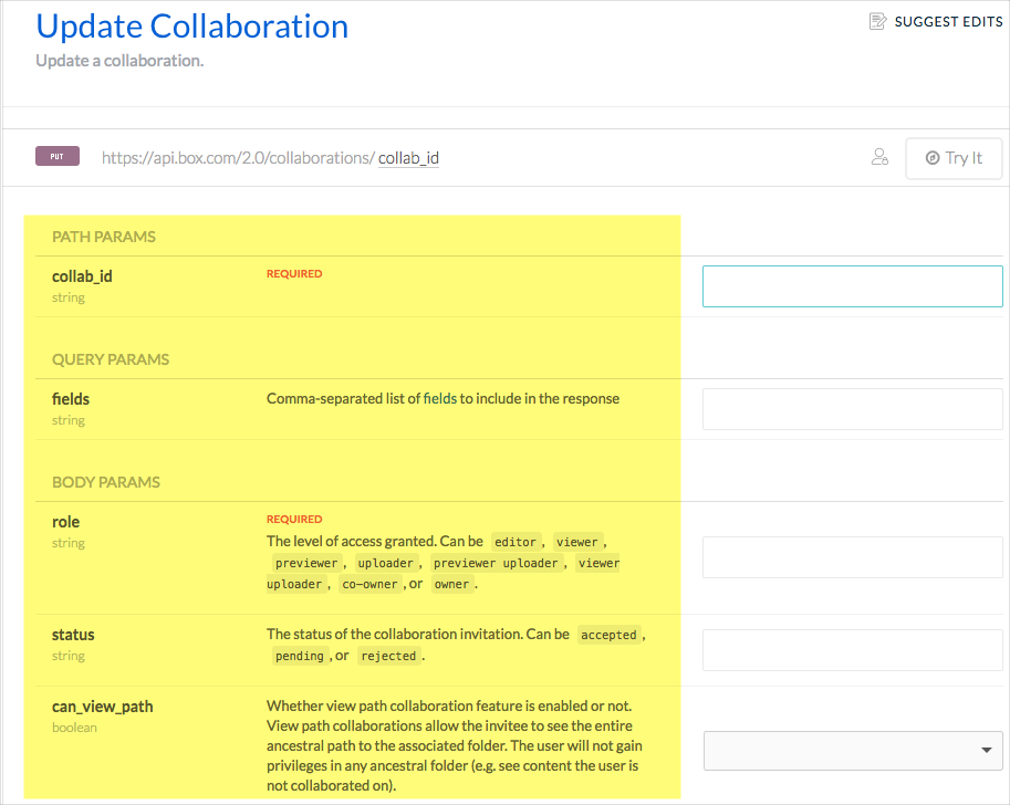 Tip: Термины для каждого из этих типов параметров взяты из спецификации OpenAPI, которая определяет формальную спецификацию, которая включает описания каждого типа параметра (см. Шаг 4 Объект ). Использование терминологии промышленного стандарта поможет разработать словарь элементов API для их описания.