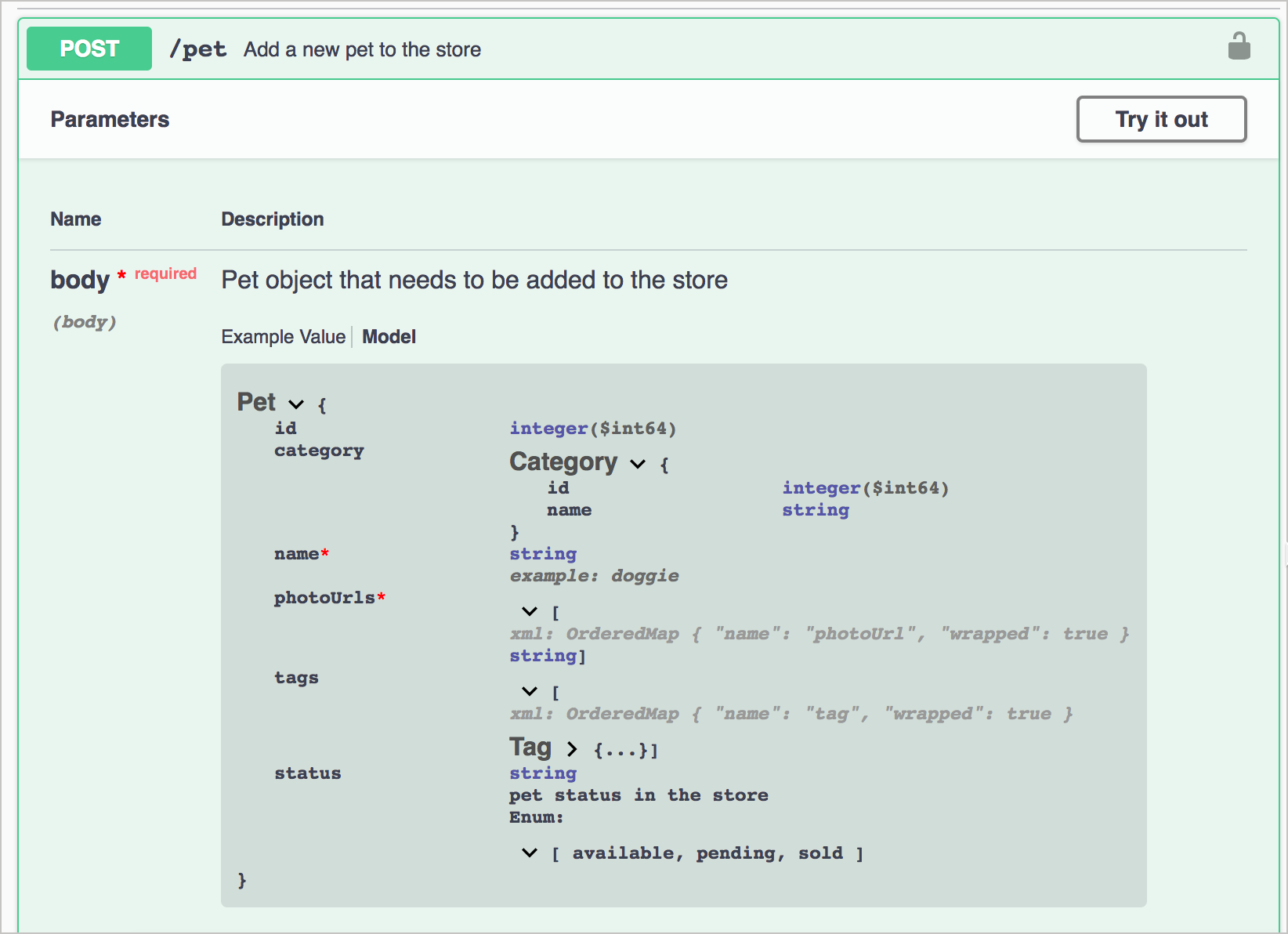 Посмотрим на Swagger Petstore для изучения. “Пример значения” показывает образец синтаксиса вместе с примерами. При нажатии на ссылку “Модель””, видим пример параметра тела запроса и описания каждого элемента.