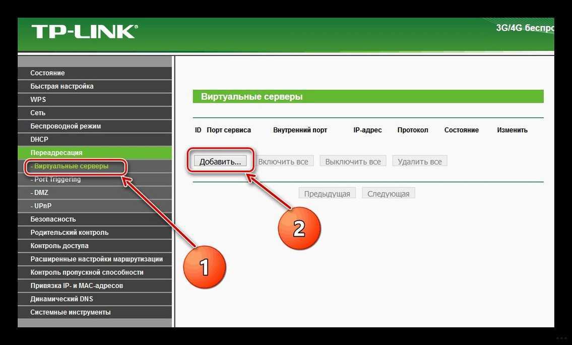 - В настройках устройства переходим в «Межсетевой экран» «Виртуальные серверы».