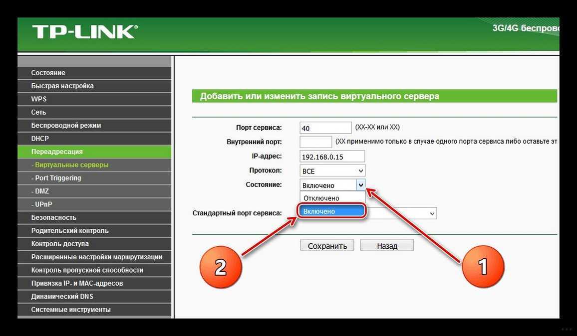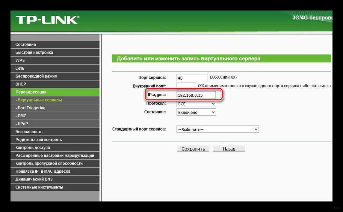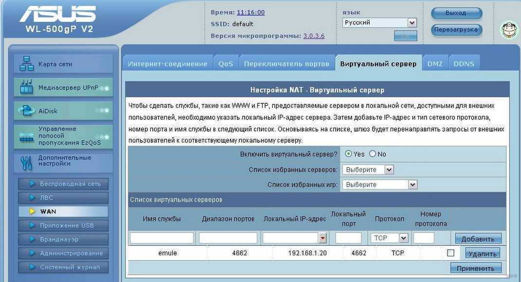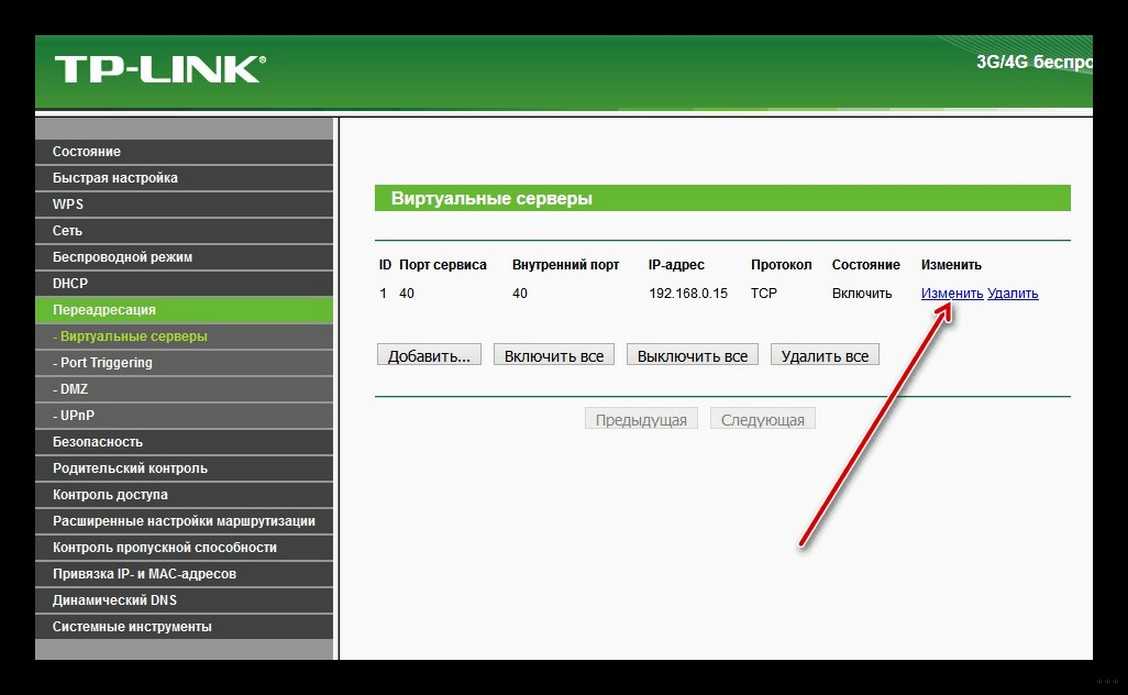 Удаляется и изменяется правило в подразделе «Виртуальные серверы» раздела «Переадресация».