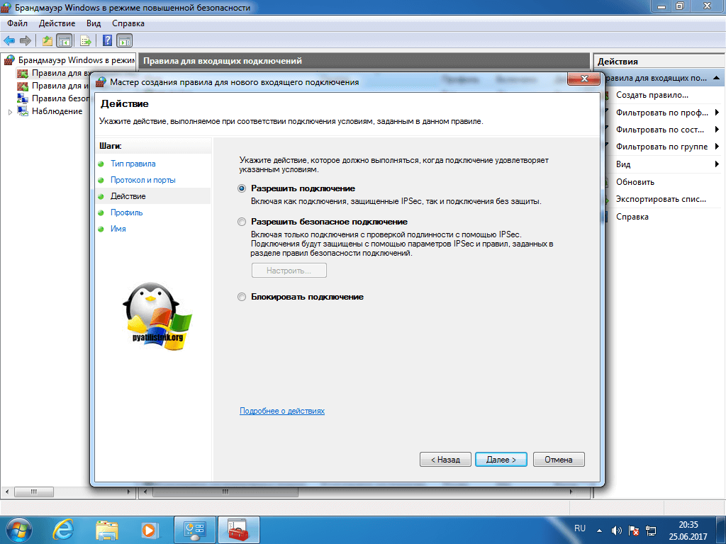 Если нужно открыть несколько портов, добавляем их через запятую. Жмём «Далее» и указываем действие, в данном случае «Разрешить подключение».