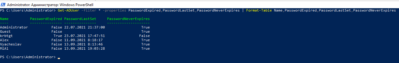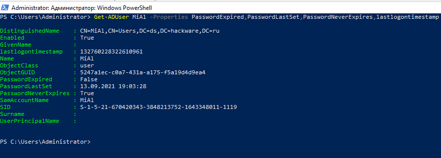 По умолчанию командлет Get-ADUser возвращает только 10 основных атрибутов пользователя (из более чем 120 свойств учётной записи пользователя): DistinguishedName, SamAccountName, Name, SID, UserPrincipalName, ObjectClass, статус учётной записи (Enabled: True/False в соответствии с атрибутом UserAccountControl AD) и так далее. В этом случае вывод командлета не содержит информации о времени последней смены пароля пользователя.