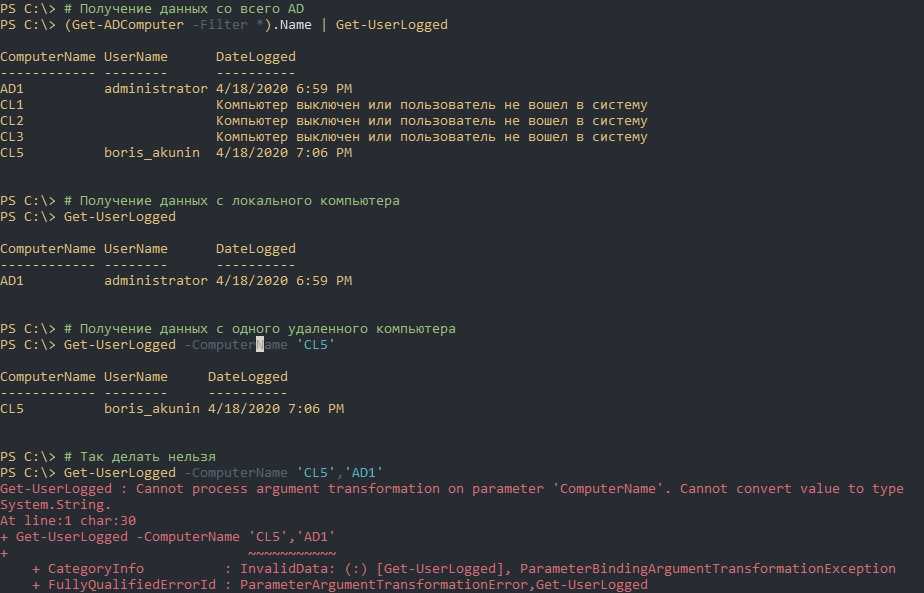 - Часть команды «quser /server:$ComputerName 2>Null » будет исключать некоторые ошибки, которые связаны с выключенными компьютерами. Иначе — будут выводиться красные сообщения мешающие выводу;