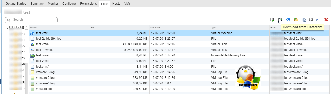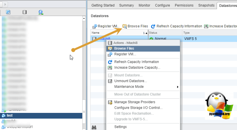 В веб-интерфейсе откройте вкладку «Datastores», и выберите там пункт «Browse Files», для просмотра содержимого на данном хранилище.