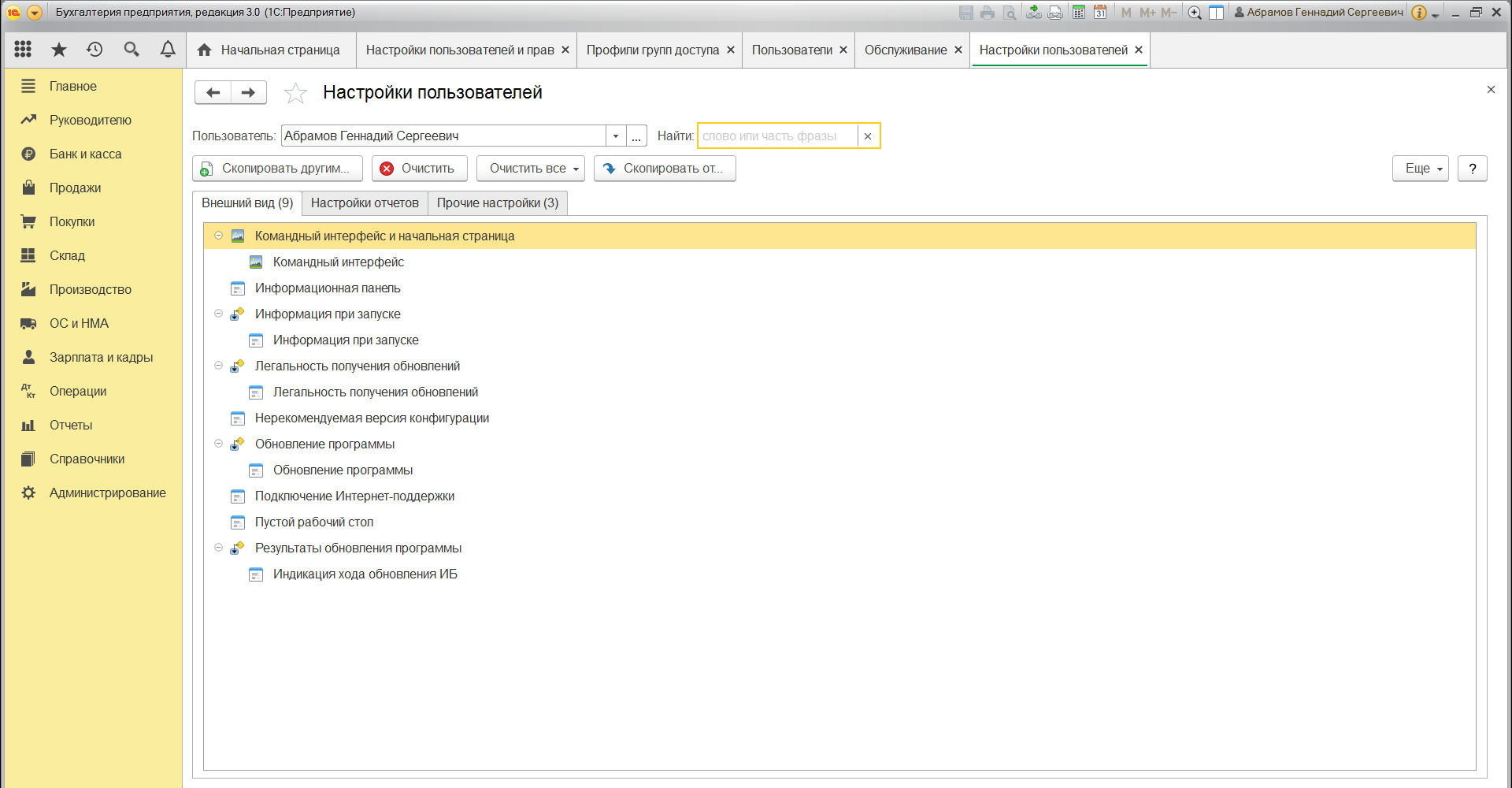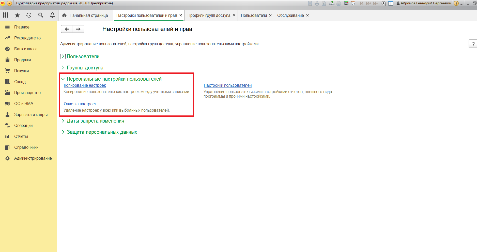 - Администрирование и Администрирование данных — позволяют выполнять административные действия в конфигураторе: добавлять и удалять пользователей, настраивать права доступа пользователей, просматривать список активных пользователей, изменять конфигурацию, обновлять конфигурацию базы данных, выгружать и загружать базу данных в файл/из файла, просматривать журнал регистрации и прочие административные действия.