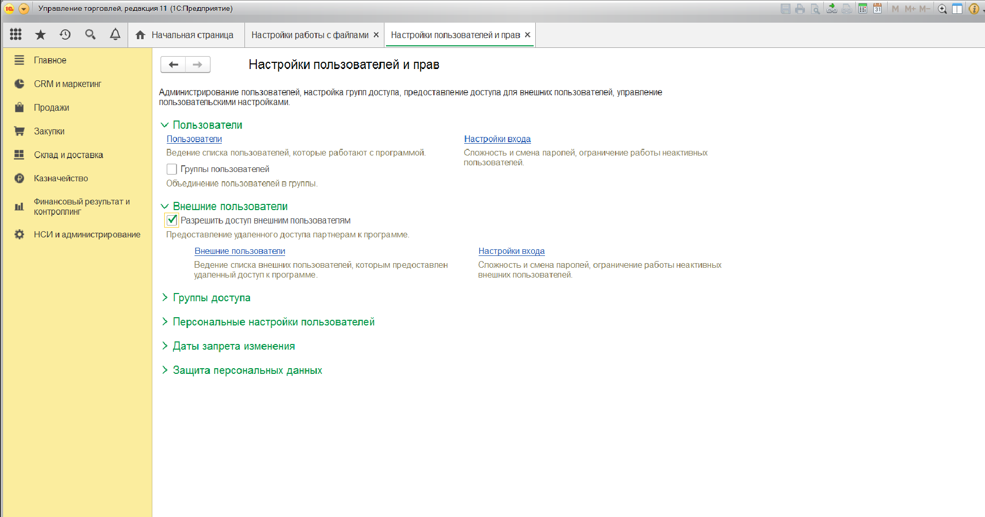 - Интерактивное открытие внешних обработок, Интерактивное открытие внешних отчетов — позволяет в пользовательском режиме открывать внешние обработки и внешние отчеты через меню Файл — Открыть.
