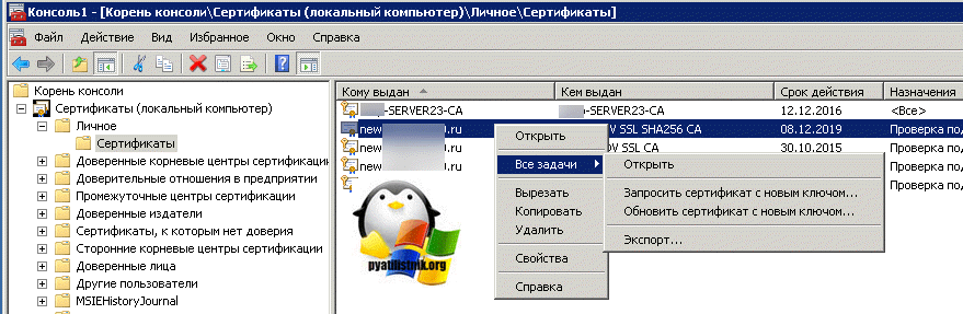 Бывают ситуации, что на вашем сервере по каким-то причинам, в папке запросы на сертификат, может не оказаться вашего, в этом случае вам необходимо будет перейти в этой же mmc в раздел «Личное-Сертификаты». Выбираем нужный и делаем экспорт.