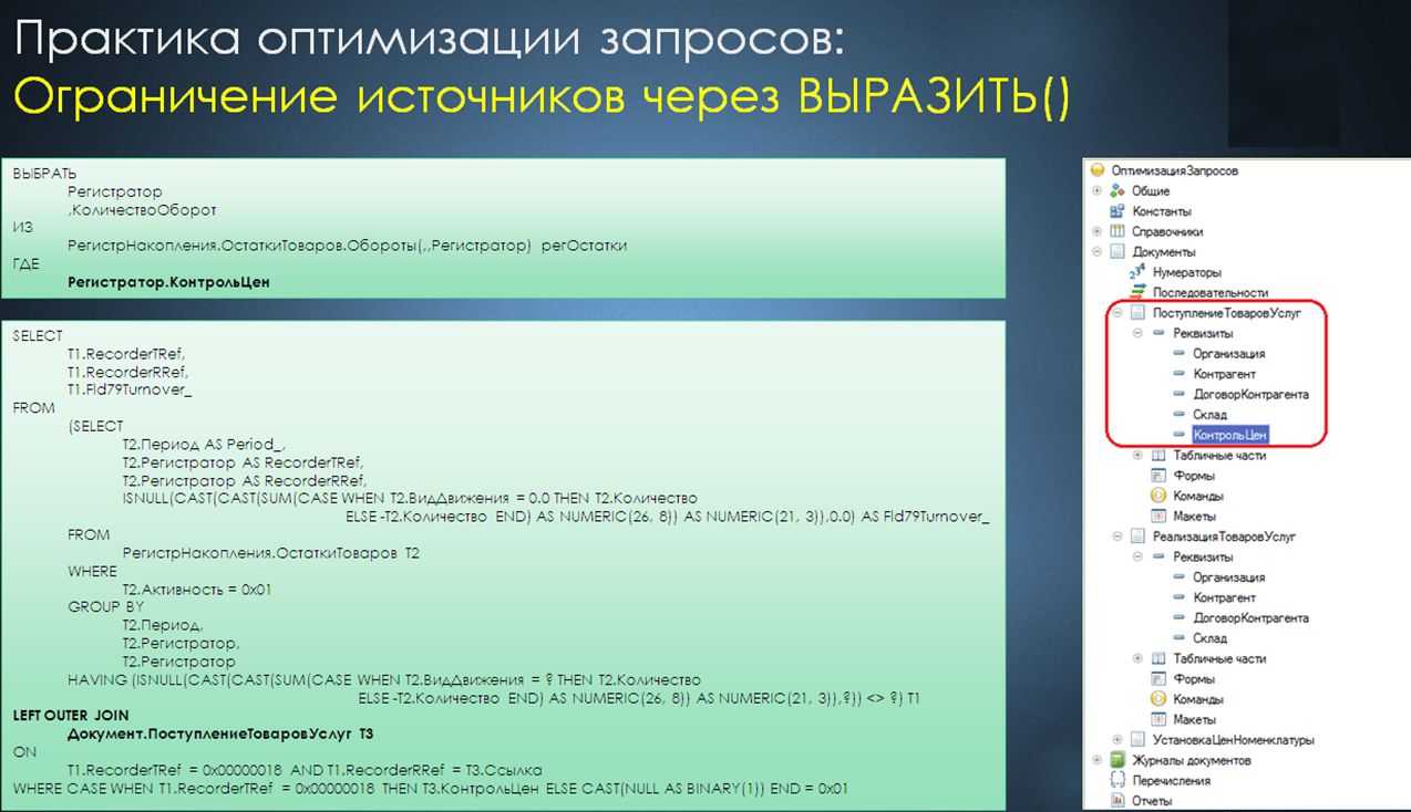 Например, на слайде показан текст запроса, демонстрирующий обращение к полю составного типа «Регистратор» (а именно к его вложенному свойству «Контроль цен»). Здесь видно, что запрос, в конечном счете, не производит обращения к документу «Реализация товаров и услуг», поскольку свойства «Контроль цен» у этого вида документов нет, и, соответственно,сама платформа не генерирует никаких дополнительных левых соединений. А на практике я встречаю чрезмерные усилия разработчиков (не всех, конечно), направленные на то, чтобы исключить лишние источники данных, хотя они в этом случае и так не будут подключены. И это тоже нередко встречающаяся ситуация.