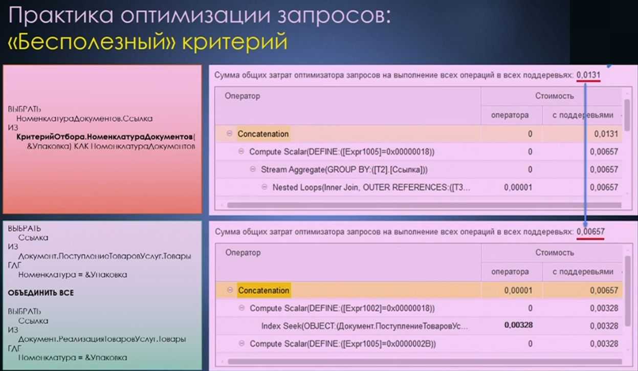 Однако при использовании критерия отбора для выборки определенных номенклатурных позиций из документов различных видов мы не получим той эффективности, которую можем получить, используя аналогичное по функциональности, но более объемное по написанию объединение запросов. Это связано с тем, что в первом случае физически на стороне СУБД будет сформирован гораздо более сложный запрос, чем во втором случае. Как вы здесь видите, запрос с объединением работает более эффективно, чем использование критерия отбора.
