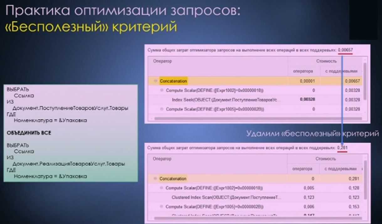 - При необходимости жертвуйте компактностью и универсальностью кода ради производительности. Как правило, для выполнения конкретного запроса в данных условиях не нужны все возможные типы данной ссылки. В этом случае, следует ограничить количество возможных типов при помощи функции ВЫРАЗИТЬ. Если данный запрос является универсальным и используется в нескольких разных ситуациях (где типы ссылки могут быть разными), то можно формировать запрос динамически, подставляя в функцию ВЫРАЗИТЬ тот тип, который необходим при данных условиях. Это увеличит объем исходного кода и, возможно, сделает его менее универсальным, но может существенно повысить производительность и стабильность работы запроса.