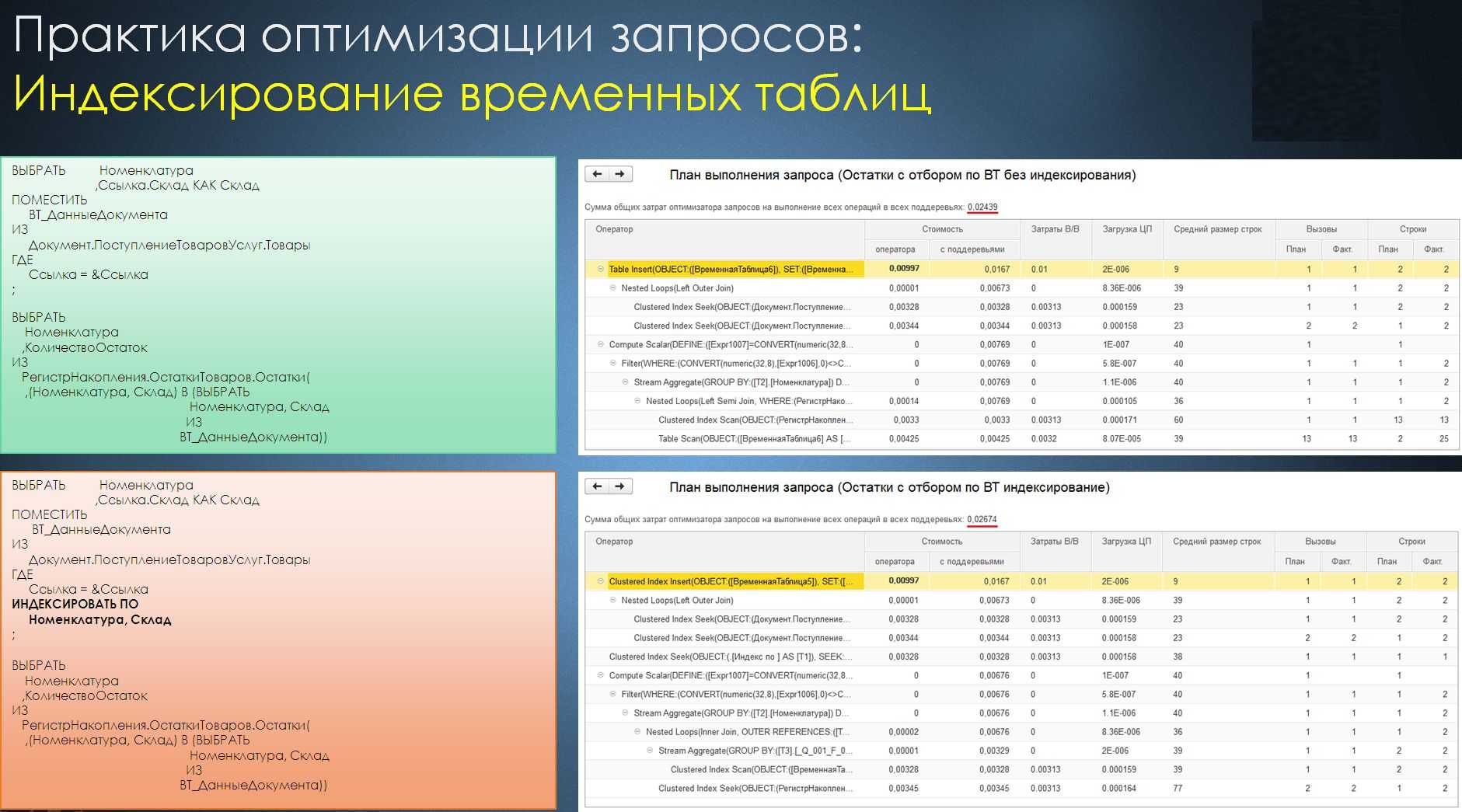 Это – те основные моменты, которые мы можем отметить в процессе оптимизации тех или иных запросов. И эта методика, как я уже говорил, описана в открытом источнике на ИТС. В частности, там есть информация о том, как можно, используя критерии отбора, получить нужный индекс, не меняя типовую конфигурацию.
