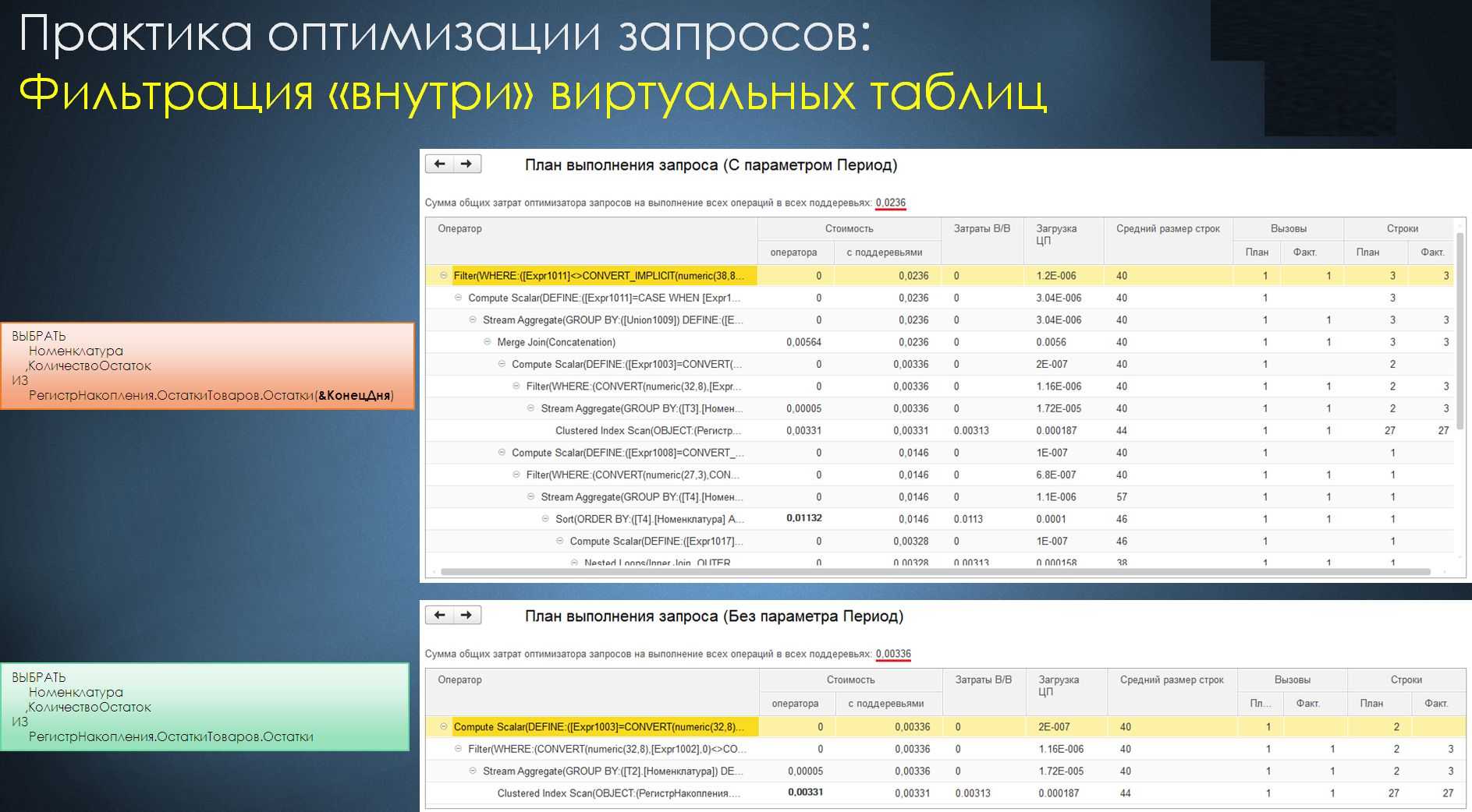 Итак, в первом примере вы видите, что идет обращение к виртуальной таблице остатков. При этом в первом случае для отбора по товарам документа используется вложенный запрос, а во втором случае – вложенный запрос с использованием временной таблицы, что, по идее, должно предоставить нам возможности для более эффективной работы с данными. Однако этого не происходит.