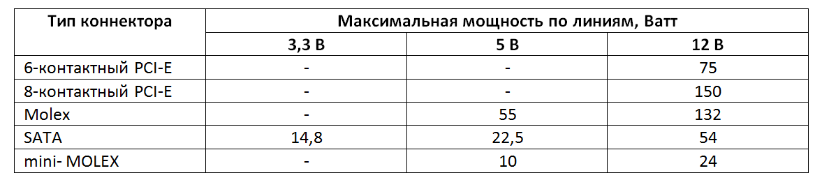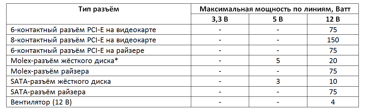Следующая таблица – максимальная потребляемая мощность разъёмов на различных устройствах, которые могу входить в состав фермы для майнинга.