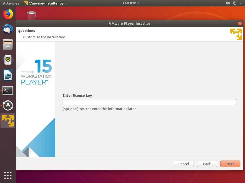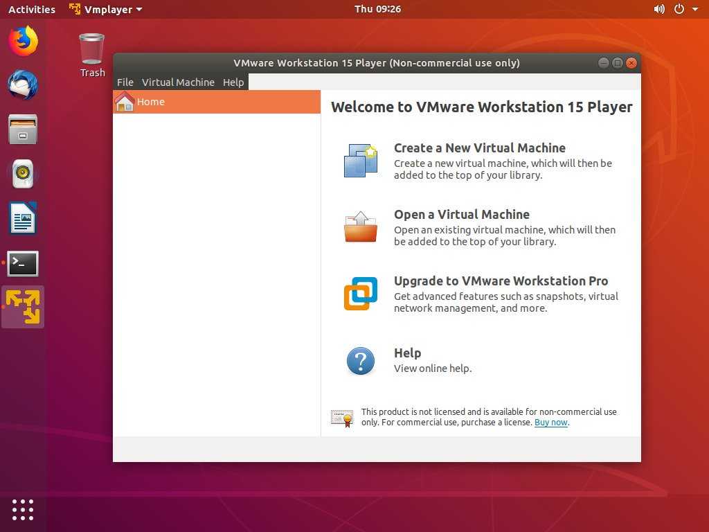 Теперь, когда VMware Workstation Player установлен в вашей системе Ubuntu, вы можете запустить его, щелкнув значок VMware Player ( ).