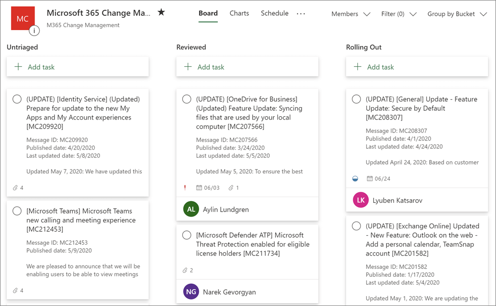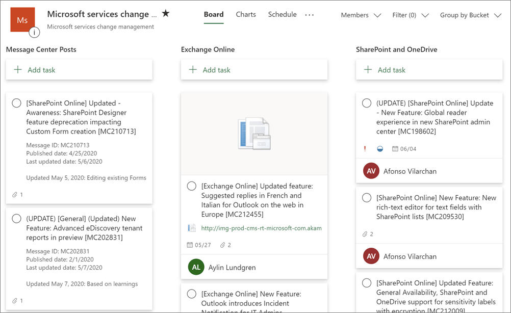 Если вы часто назначаете и отслеживаете задачи центра сообщений по службе или приложению, с которыми они связаны, вы можете упорядочить свой план по службе. В этом случае вам потребуется создать сегмент под названием «Записи центра сообщений» для синхронизации сообщений и превращения их в задачи. Кроме того, вы создадите сегмент для каждой службы. Например, сегменты могут называться «Exchange Online», «SharePoint и OneDrive», «Teams» и «Общий». Вы и другие участники плана можете перемещать задачи из записей центра сообщений в нужный столбец, а затем назначать их, устанавливать сроки выполнения, добавлять контрольные списки, добавлять вложения и отслеживать ход их выполнения иным способом.