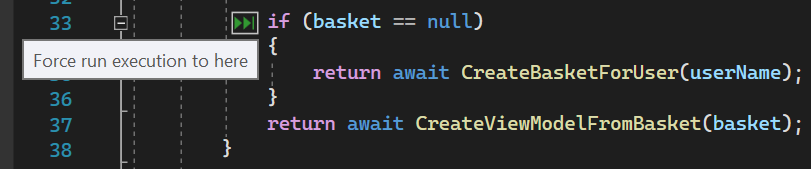 Когда работа отладчика приостановлена, вы можете навести указатель на оператор в исходном коде, удерживая нажатой клавишу SHIFT, и выбрать элемент Принудительное выполнение до текущей позиции (значок с двумя зелеными стрелками). При выборе этого параметра приложение присоединяет отладчик Visual Studio и приостанавливает выполнение в положении курсора. Все точки останова и первичные исключения, обнаруженные во время выполнения, временно отключаются.
