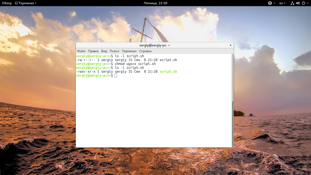 Мы разрешаем выполнять запуск sh linux всем категориям пользователей — владельцу, группе файла и остальным. Следующий важный момент — это то место где находится скрипт, если вы просто наберете script.sh, то поиск будет выполнен только глобально, в каталогах, которые записаны в переменную PATH и даже если вы находитесь сейчас в той папке где находится скрипт, то он не будет найден. К нему нужно указывать полный путь, например, для той же текущей папки. Запуск скрипта sh в linux: