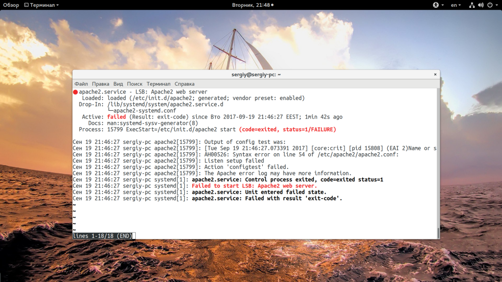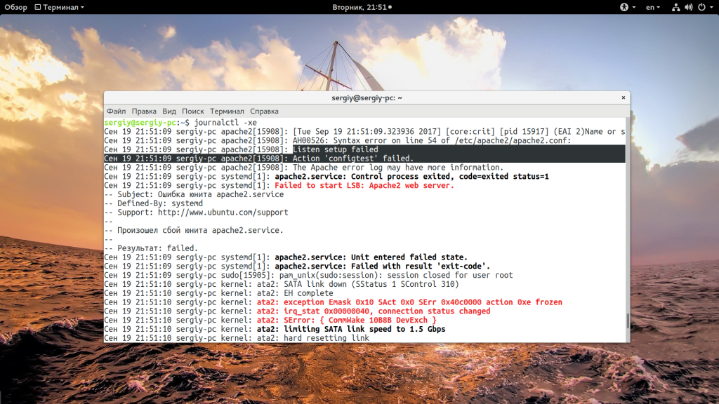 То есть нам нужно выполнить systemctl status apache2.service или journalctl -xe чтобы получить больше сведений. Выполните сначала первую команду: