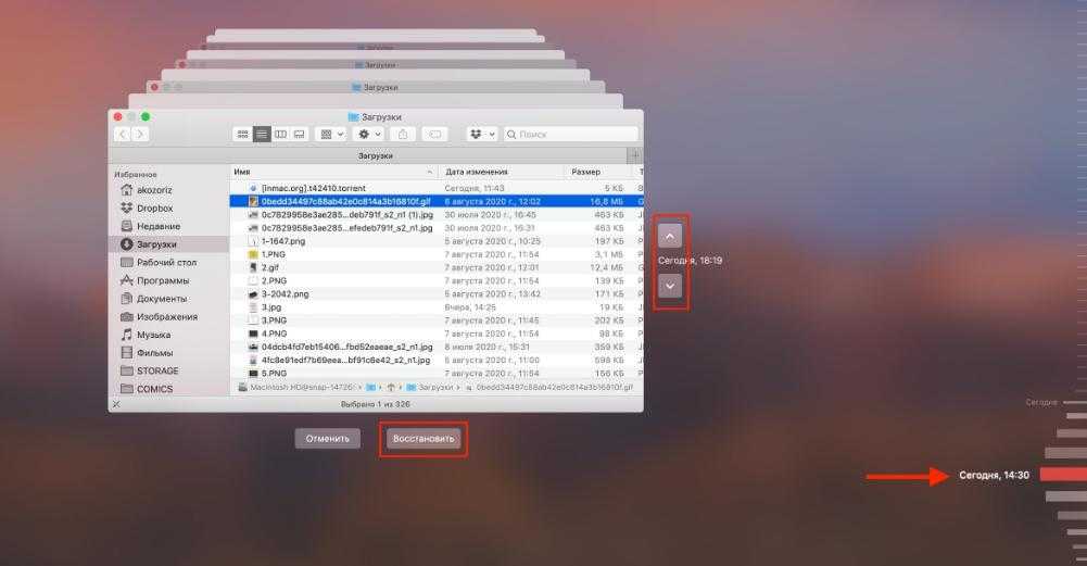 - Навигация по копиям осуществляется по стрелочка или по временной шкале справа. При выборе нужной резервной копии нажмите «Восстановить«. Все восстановленные файлы появятся в той же папке, откуда они были удалены.
