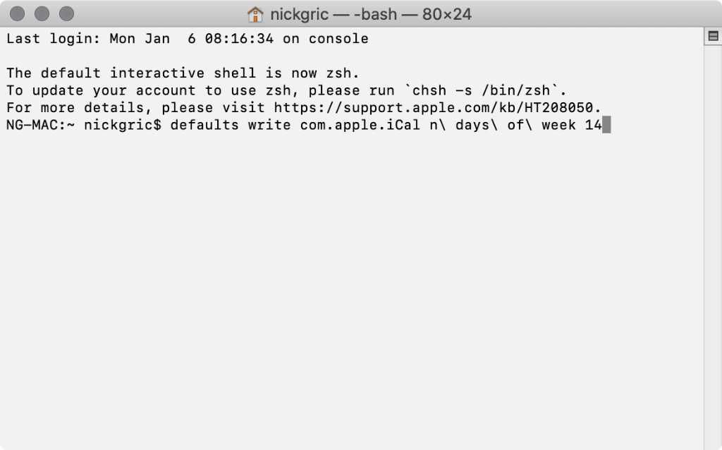 Что сделать: откройте «Терминал» и используйте следующую команду: defaults write com.apple.iCal n\ days\ of\ week 14 — последняя цифра здесь отвечает за количество дней в разделе «Неделя».