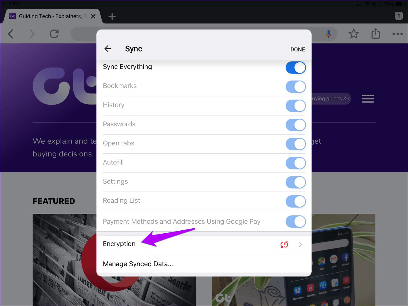 Шаг 1. На панели «Настройки Chrome» нажмите свой профиль, нажмите «Синхронизация», прокрутите вниз, а затем нажмите «Шифрование».