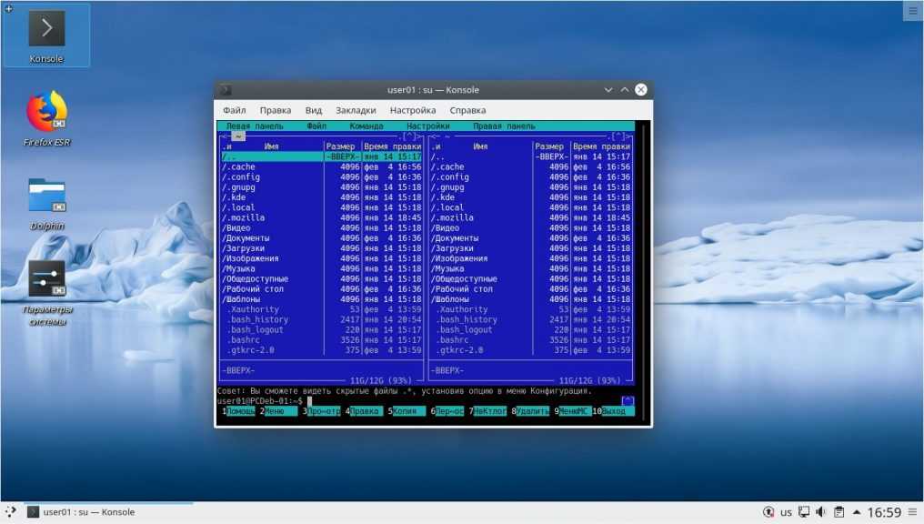 Запуск файлового менеджера Midnight Commander для пользователя user01: