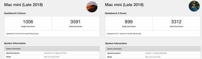 Сравнительный тест Geekbench 5 на MacOS Mojave (слева) и macOS Big Sur (справа)