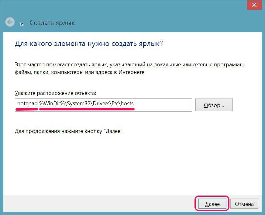 В качестве исполняемой программы выберем Блокнот. Нажмите ПКМ на Рабочем столе и в контекстном меню «Создать», откройте пункт «Ярлык». Запустится мастер создания ярлыка, сперва введите полный адрес к хостс с приставкой программы, которая будет запускать этот самый файл: «notepad %WinDir%\System32\Drivers\Etc\hosts» — скопируйте содержимое кавычек в поле адреса и жмите кнопку «Далее».