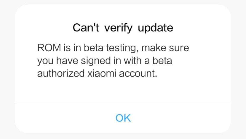 Перевод: Не могу проверить обновление. Версия находится в стадии бета-тестирования, убедитесь, что вы вошли в систему с авторизованной учётной записью бета-тестера Xiaomi.