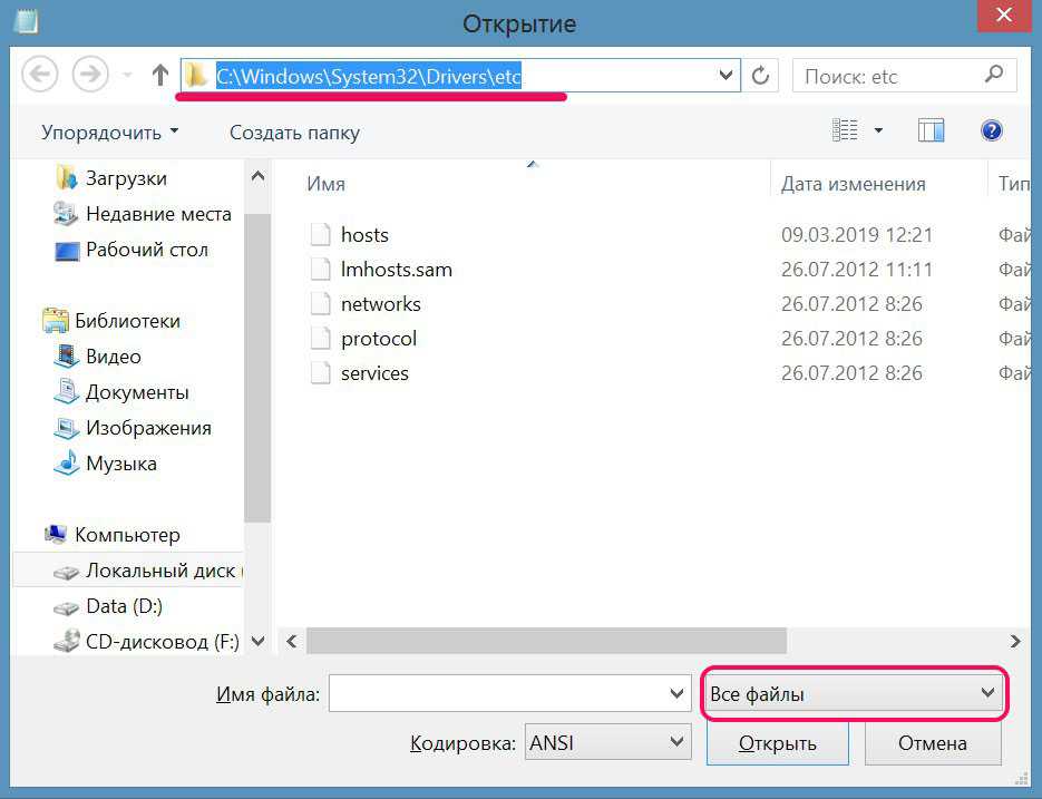 Чтобы вам было проще, вы можете использовать следующий адрес для поиска: «%WinDir%\System32\Drivers\Etc» — скопируйте содержимое кавычек в строку адреса окна открытия файла, нажмите «Ввод», и вы попадёте в нужную папку. Иначе вы можете самостоятельно проследовать по заданному пути, до самой папки etc.