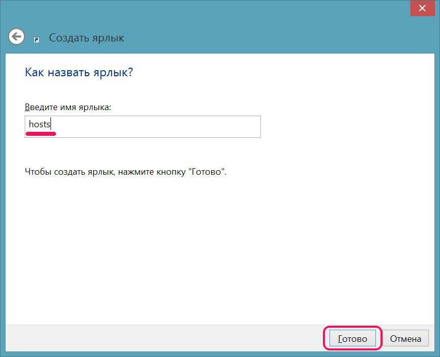 На этом заключительном этапе нужно назвать будущий ярлык, вы можете придумать любое имя, или, не мудрствуя лукаво, записать его как hosts.