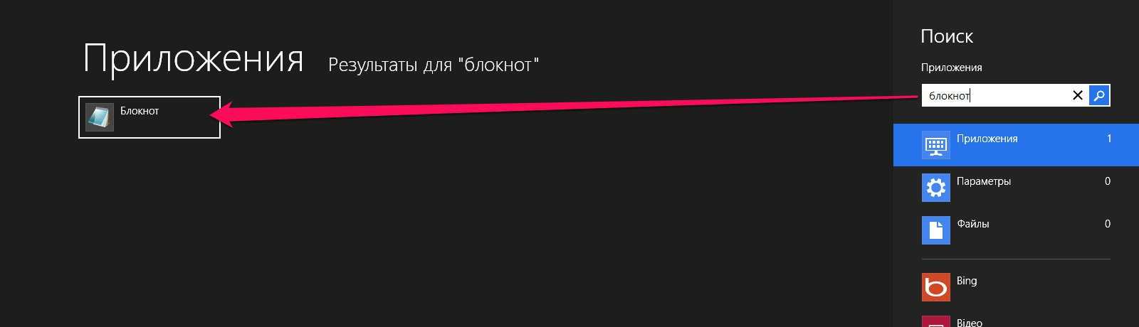 В этом методе мы не будем пользоваться никаким сторонним ПО, только штатными средствами операционной системы. Итак, сперва найдите программу пригодную для открытия текстовых файлов, сгодится обычный Блокнот, WordPad или Microsoft Word. Возможно, ярлыки этих программ уже есть на вашем Рабочем столе, если нет, используйте средства Поиска, нажмите комбинацию клавиш Win+F, чтобы получить доступ к строке поиска, и введите одно из названий программы. Если у вас Windows 8, предварительно выберите категорию поиска «Приложения».