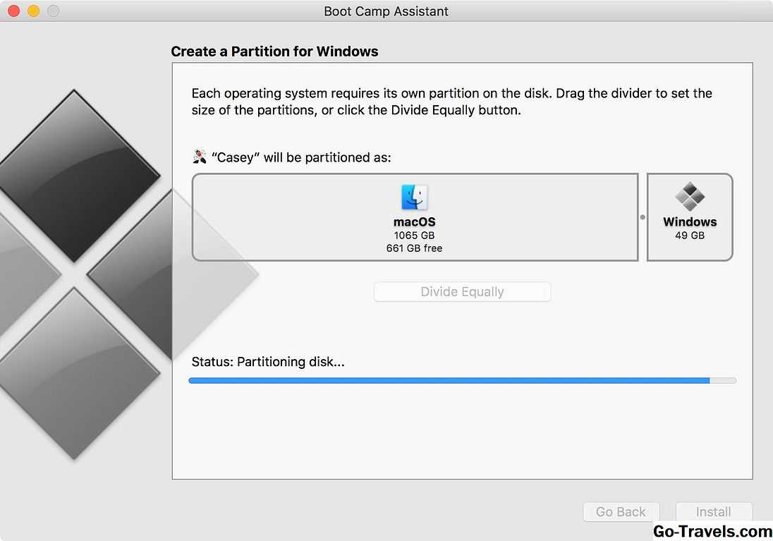 Одной из основных функций Boot Camp Assistant является разделение диска Mac, добавив раздел, посвященный Windows. Процесс секционирования позволяет вам выбрать, сколько места будет занято из вашего существующего раздела Mac и назначено для использования в разделе Windows. Если ваш Mac имеет несколько дисков, как это делают некоторые iMac, Mac mini и Mac Pro, у вас будет возможность выбрать диск для разделения. Вы также можете выделить весь диск для Windows.