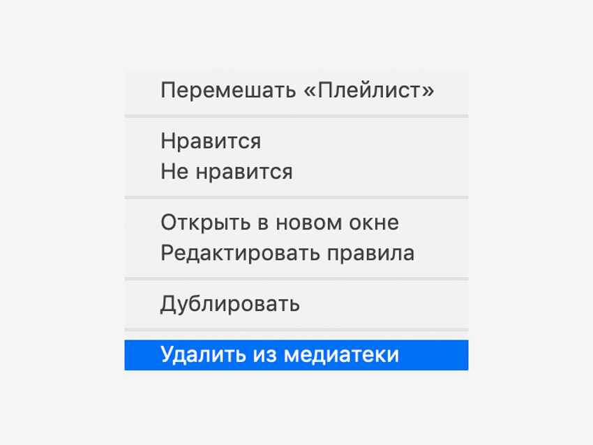 Найдите плейлист, который больше не нужен. Открывайте контекстное меню и выбирайте «Удалить из медиатеки».