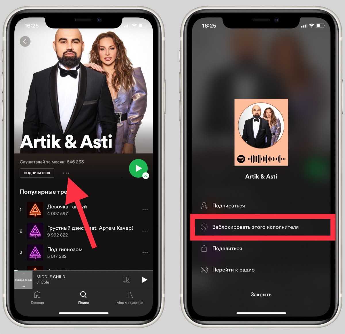 1. Открываете профиль артиста2. Нажимаете на три точки под фото3. В меню выбираете Заблокировать этого исполнителя