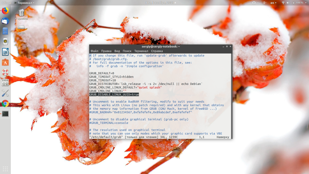 - GRUB_GFXMODE — разрешение экрана в Grub, лучшие использовать auto, чтобы система выбрала сама то что ей нужно.