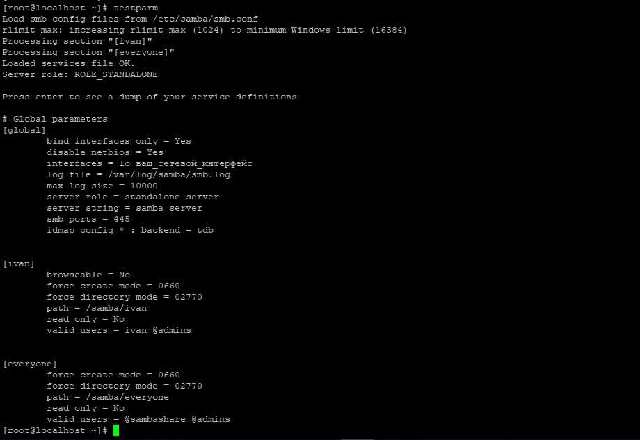 share_name — имя ресурса, используемое при доступе.path — полный путь к ресурсу в файловой системе.browsable — опоеделяет видимость ресурса для других пользователей, но не дает им прав доступа.read only — определяет возможность доступа на запись для пользователей, указанных в параметре valid users.force create mode — задает указанные права доступа к любому файлу, создаваемому в ресурсе.force directory mode — задает указанные права доступа к любой директории, создаваемой в ресурсеvalid users — список пользователей, имеющих доступ к ресурсу. Здесь можно указывать имена или группы, перед группами нужно указывать символ @, например, @admins.