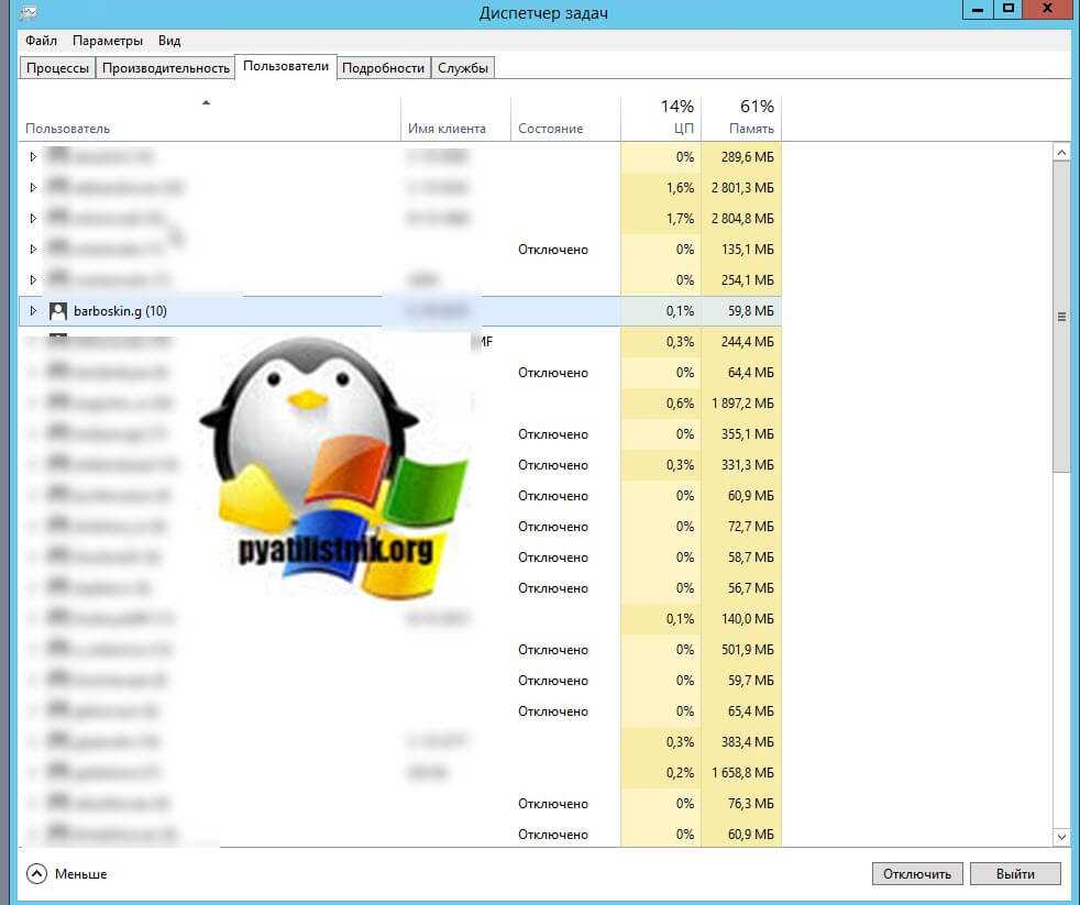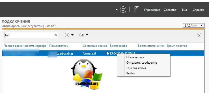 Щелкаем по нему правым кликом. В контекстном меню будет пункт «Выйти», это и соответствует завершению сессии (Log off). Так же есть пункт «Отключиться», если выберите его, то пользователь будет выброшен с терминального сервера, но его сессия останется на нем, данная операция равносильна тому, если пользователь просто нажал в окне с названием терминального сервера крестик.