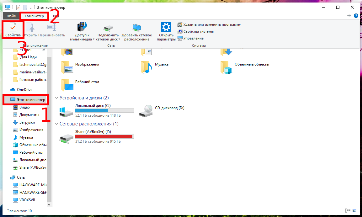 Чтобы проверить, какое имя у вашего компьютера, откройте проводник, в нём найдите вкладку «Этот компьютер», вверху нажмите кнопку «Компьютер» и в открывшемся меню нажмите кнопку «Свойства»: