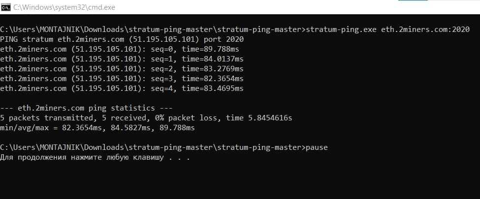 Запустите 2miners-ping.bat для проверки пула 2Miners. А для проверки другого пула замените в bat-файле адрес сервера и порт необходимого вам пула.